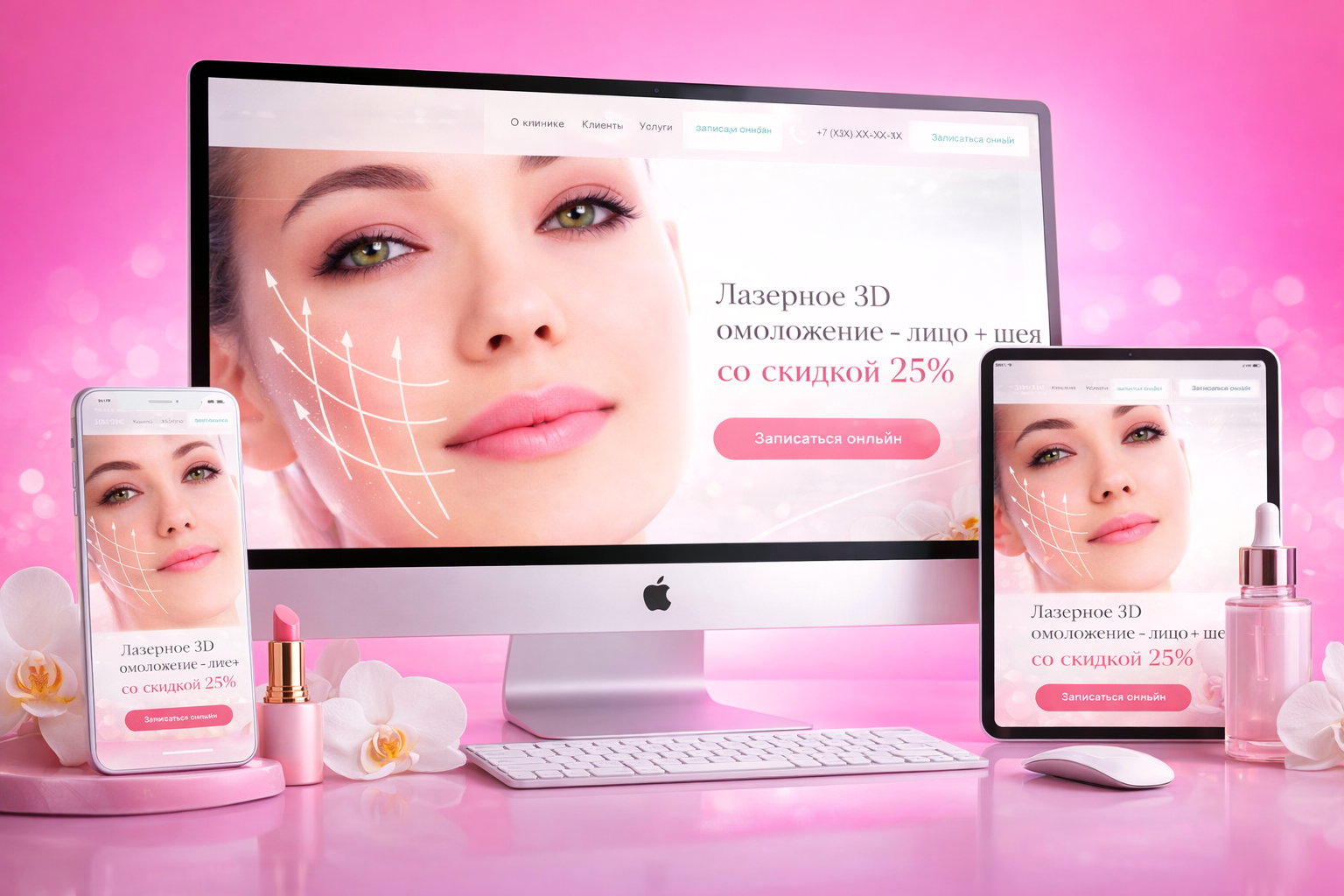 Сайт Ультилайм-эстетика.рф с первого экрана собирает атмосферу заботы и безопасности: теплая розовая среда, эффект сияющей кожи, ощущение мягкого света, будто рассеянного через ткань. Пользователь мгновенно попадает в состояние «здесь спокойно». Именно на таком эмоциональном поле строятся лучшие сайты для клиник, потому что в эстетической медицине решение запускается не логикой, а снижением внутреннего напряжения. Создание и SEO-продвижение сайта ведет веб-компания РОСТСАЙТ. Приглушенные пастельные оттенки, отсутствие жестких цветовых столкновений и фокус на лице формируют доверие к процедуре еще до того, как взгляд добирается до текста. UX-исследования beauty-сегмента фиксируют: подобные сценарии повышают готовность к записи на 20–30%, особенно в услугах с акционным триггером и чеком выше среднего.