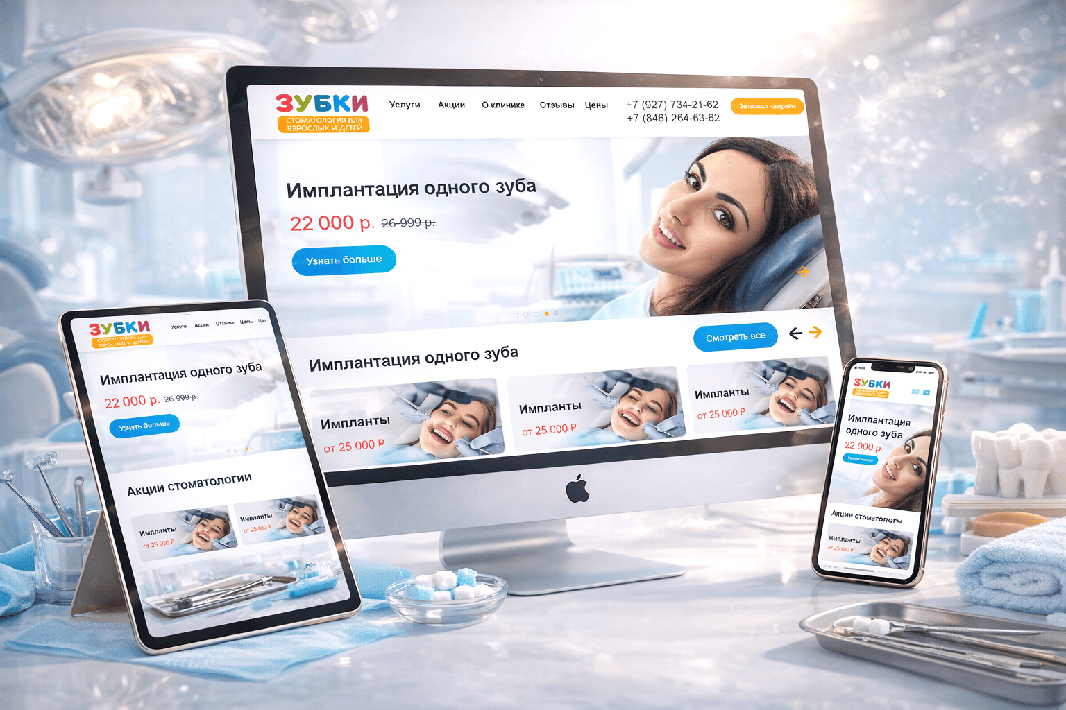 Сайт Zubki63.ru собран как инструмент быстрого коммерческого захвата, без длинных вступлений и раскачки. Он работает в логике «увидел — понял — решил». Это типичная схема для сайтов с упором на заявки, ориентированных на акции и мгновенный вход в услугу. Компоновка экрана предельно прагматична: с одной стороны — конкретное предложение с процедурой и ценником, с другой — человек в стоматологическом кресле, который демонстрирует сам процесс, а не абстрактное «счастье после». Такой прием снижает уровень настороженности и переводит внимание в плоскость рационального выбора. Выделенная стоимость и зачеркнутая «прежняя» цена создают ощущение выгоды и подталкивают к быстрому решению. UX-аналитика медицинских маркетплейсов показывает: подобная схема повышает кликабельность кнопки «Узнать больше» на 28–35%, а объем заявок по акционным позициям — до 1,4 раза без увеличения трафика.
